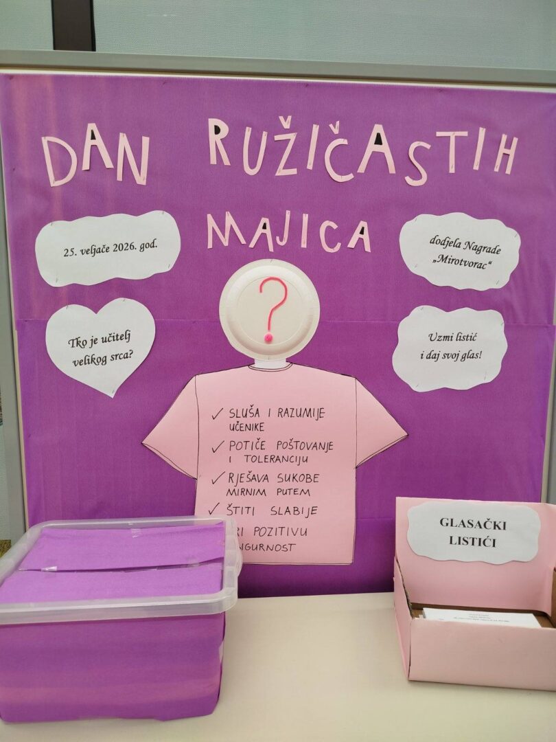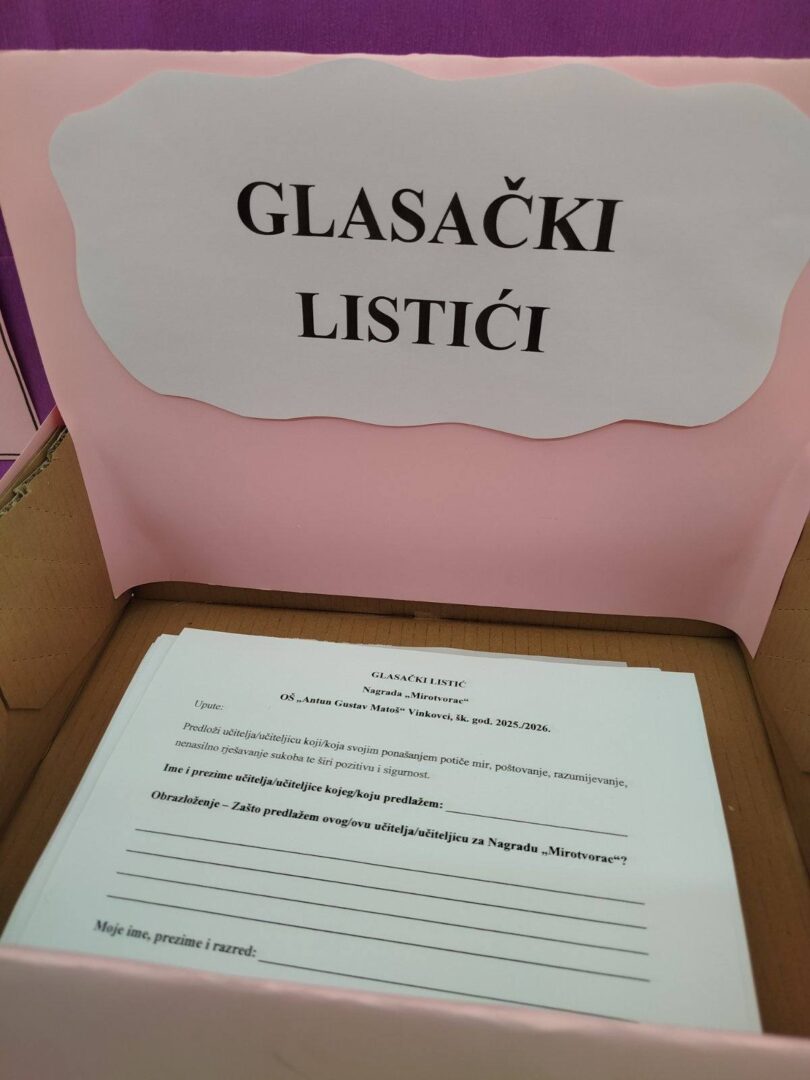 Svaki učenik može glasati za učitelja po svom izboru, ispunjavanjem glasačkog listića koji se nalazi kod glavnog ulaza u školu. Glasanje je otvoreno do petka, 20. veljače 2026. godine. Pozivamo sve učenike da iskoriste priliku i podrže učitelja koji ih inspirira, potiče na razumijevanje i svojim primjerom potiče mir, toleranciju i zajedništvo.