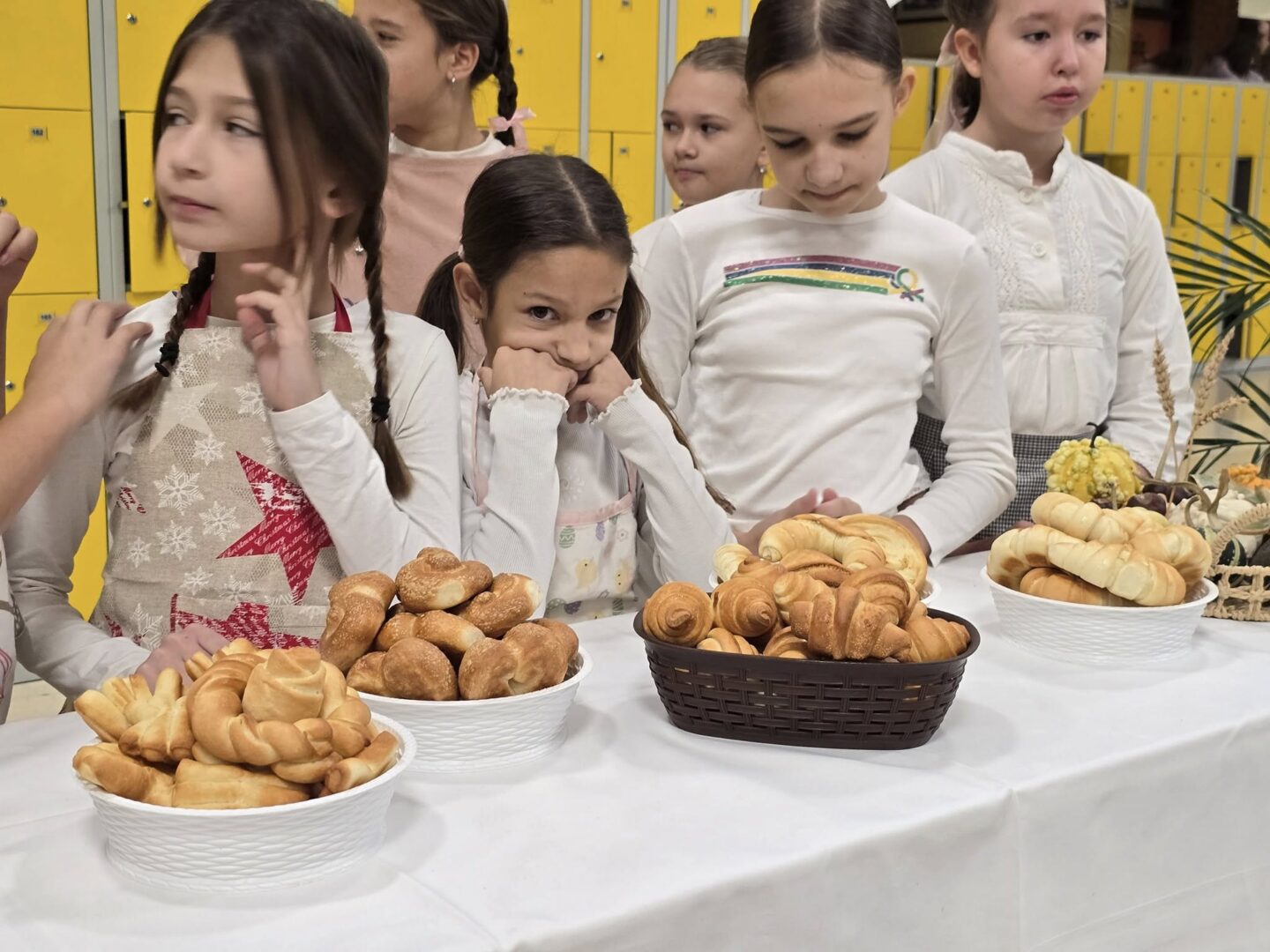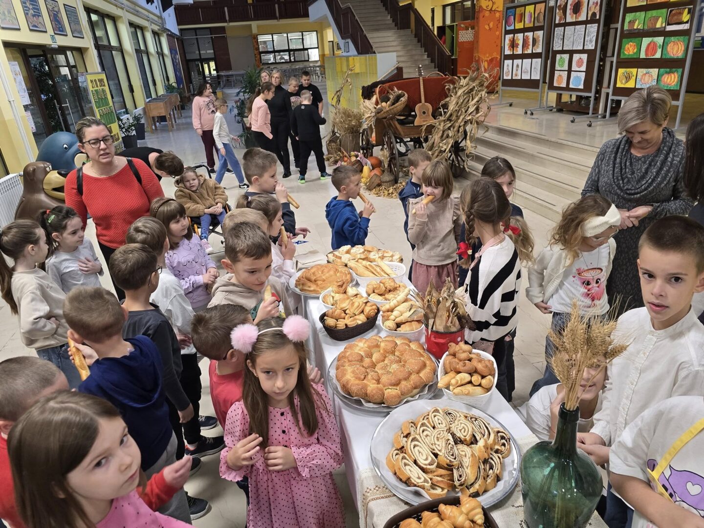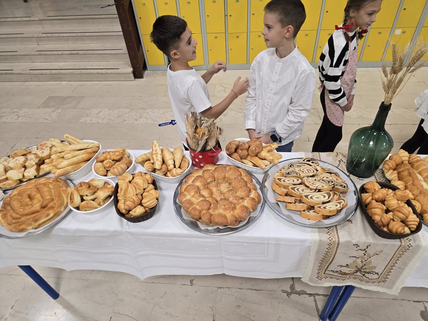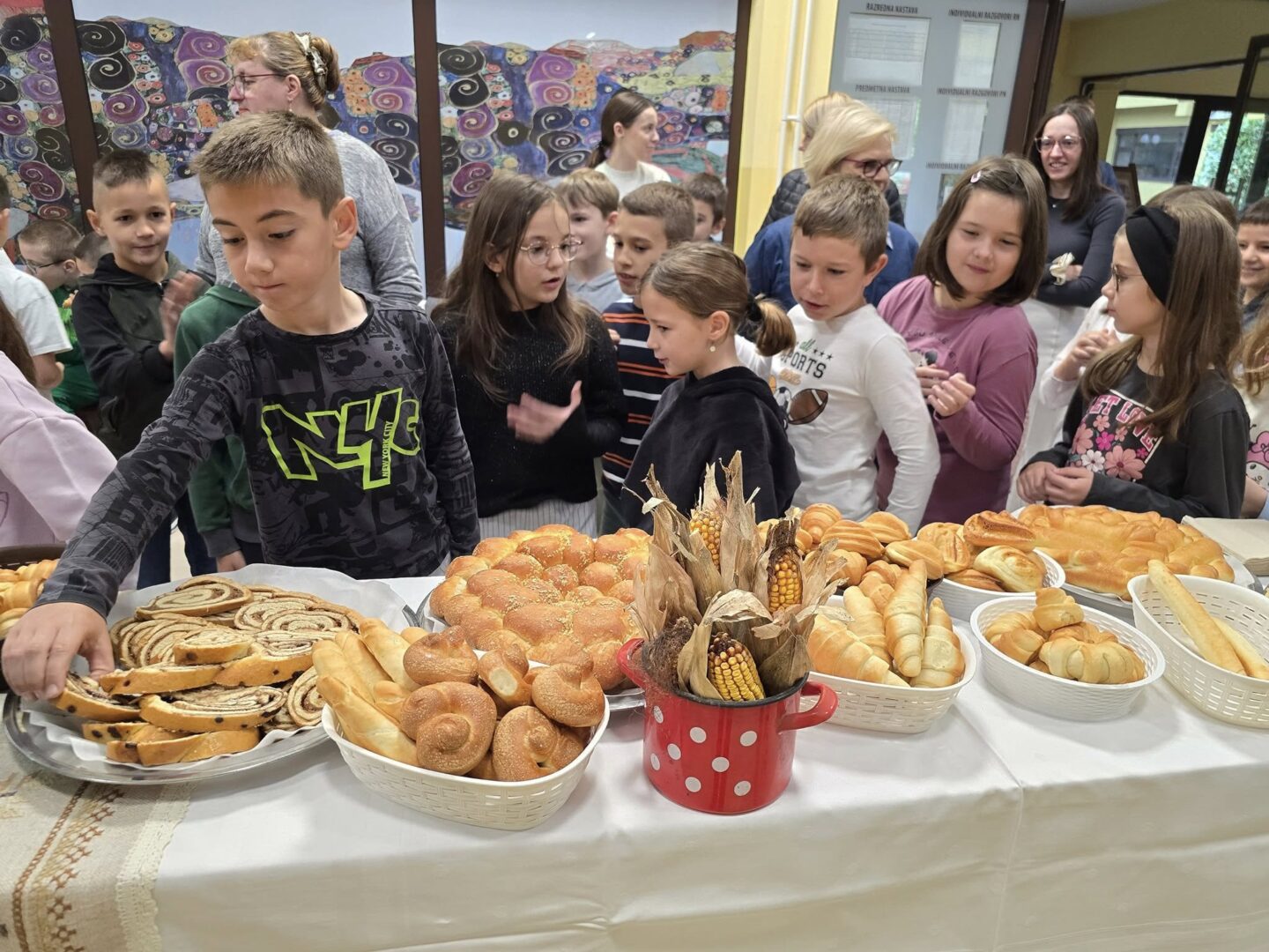 Nakon radijske emisije, učenici domaćini pozivali su svoje školske prijatelje na kušanje ukusnih pekarskih proizvoda koje su s puno pažnje pripremile naše kuharice. Školski je hol bio prigodno uređen — učiteljice su pripremile tematsku izložbu koja prikazuje dolazak težaka s njive, kola puna plodova i bogatstvo jeseni, dodatno naglašavajući ozračje zajedništva i zahvalnosti.