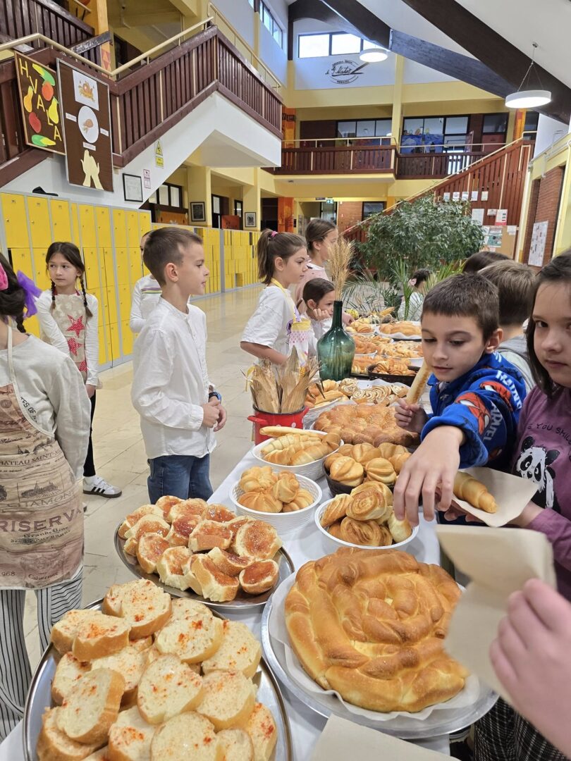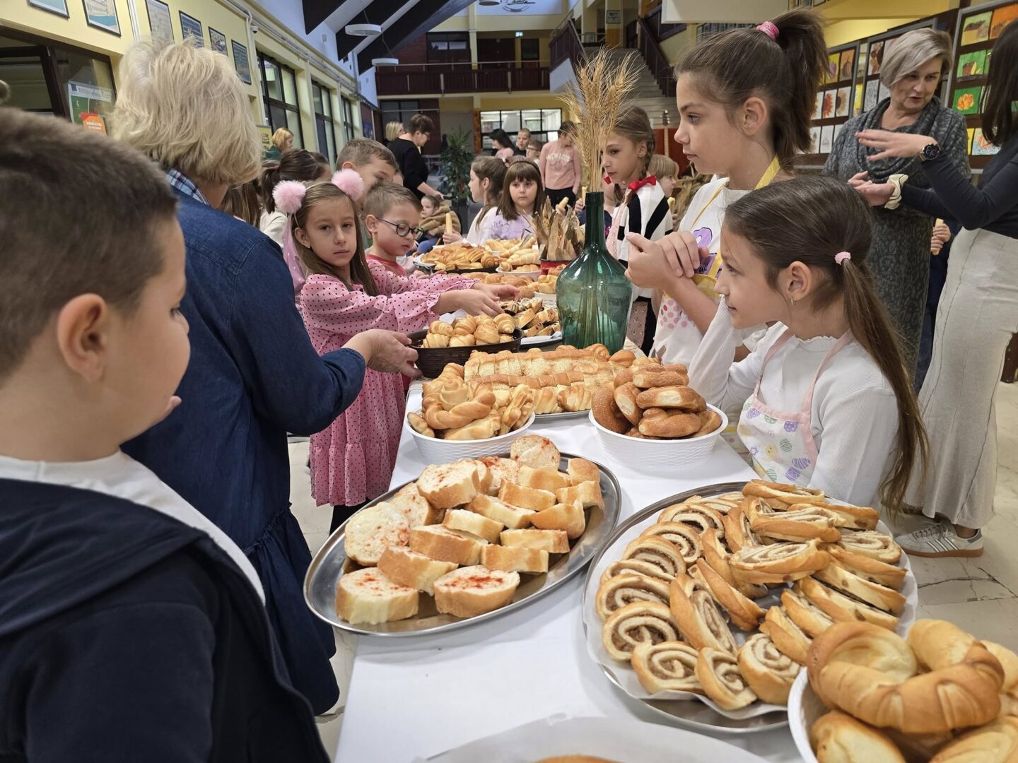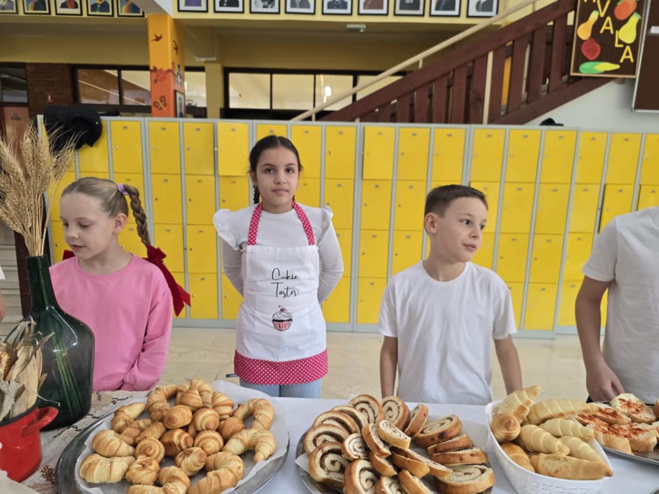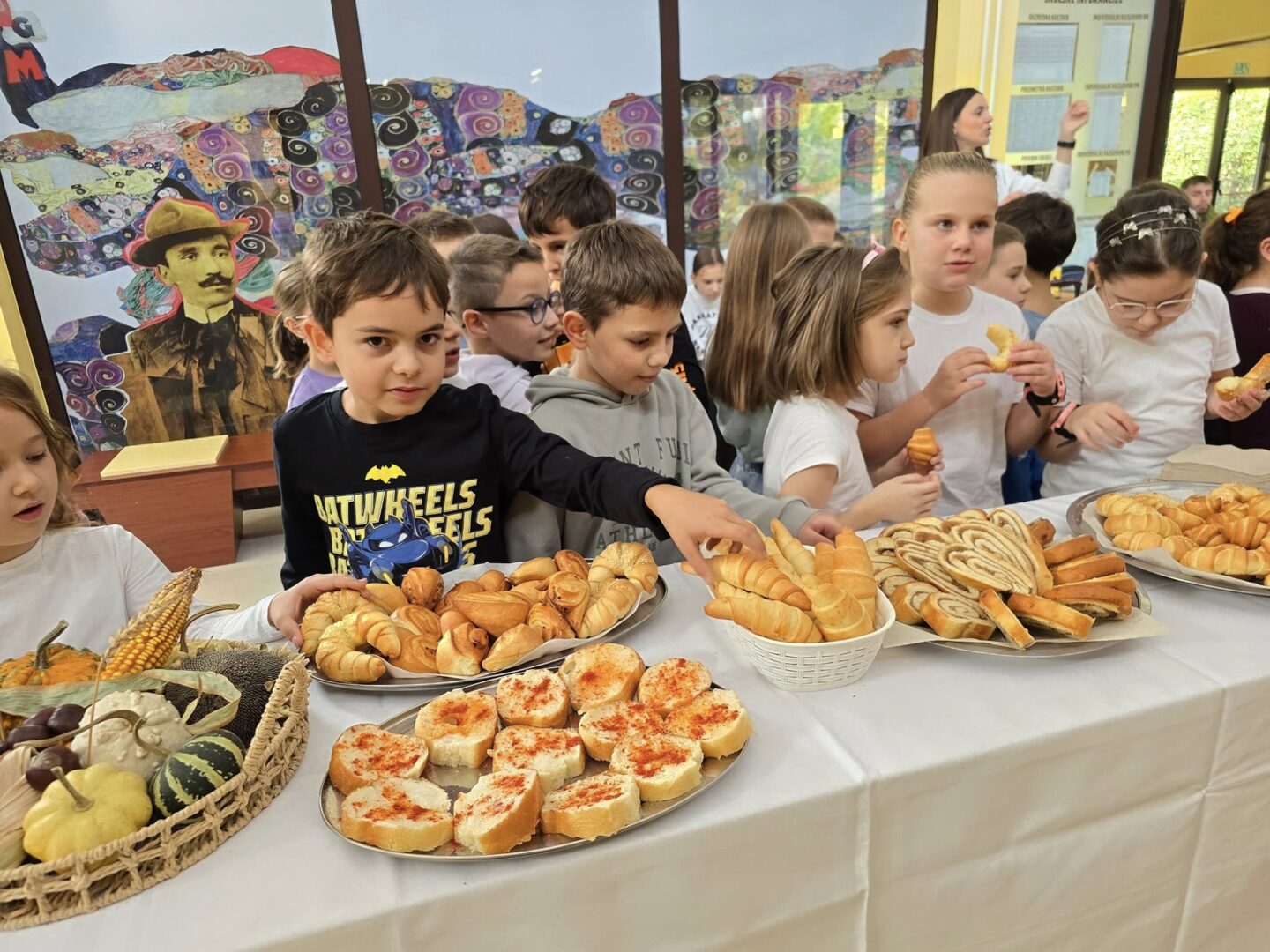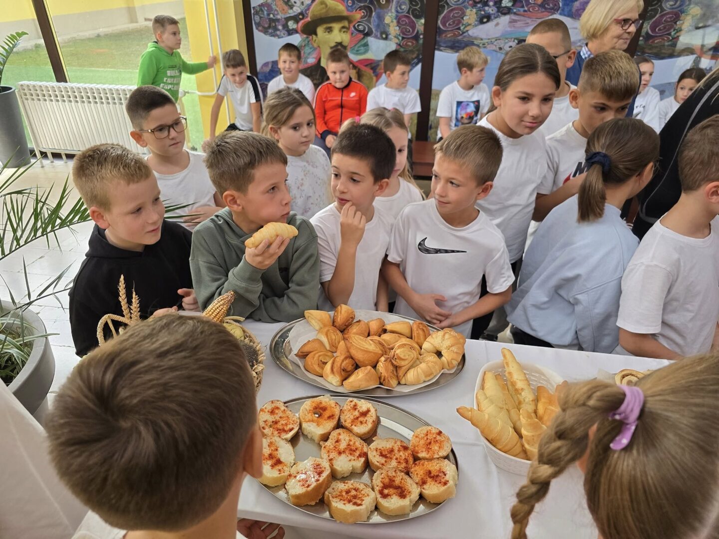 Nakon radijske emisije, učenici domaćini pozivali su svoje školske prijatelje na kušanje ukusnih pekarskih proizvoda koje su s puno pažnje pripremile naše kuharice. Školski je hol bio prigodno uređen — učiteljice su pripremile tematsku izložbu koja prikazuje dolazak težaka s njive, kola puna plodova i bogatstvo jeseni, dodatno naglašavajući ozračje zajedništva i zahvalnosti.