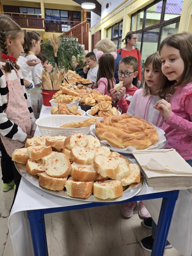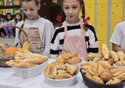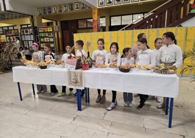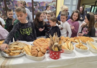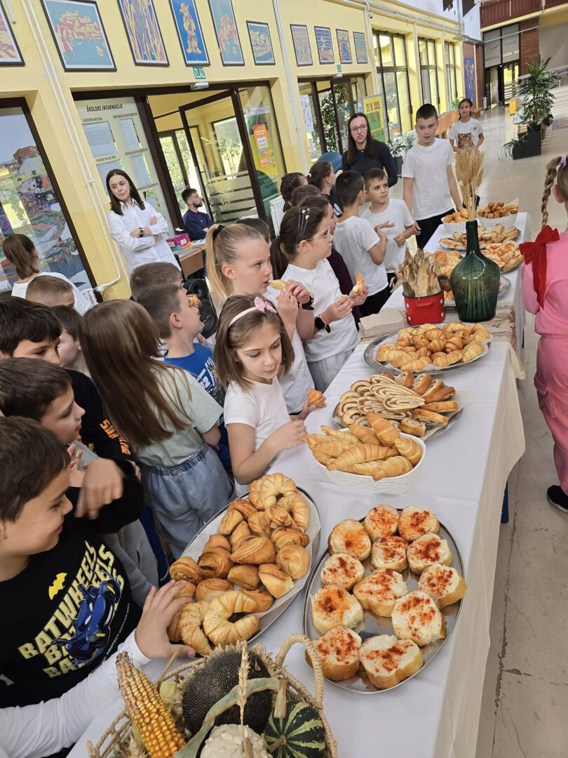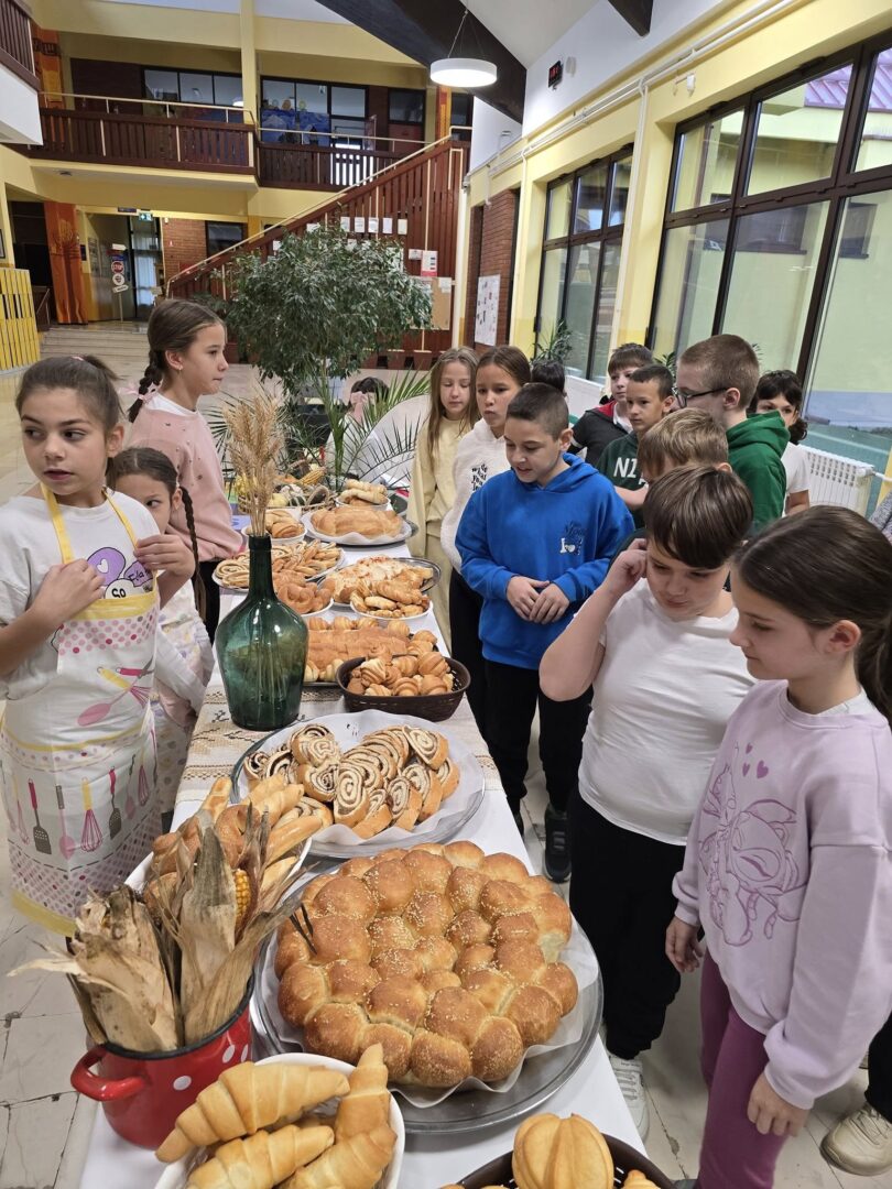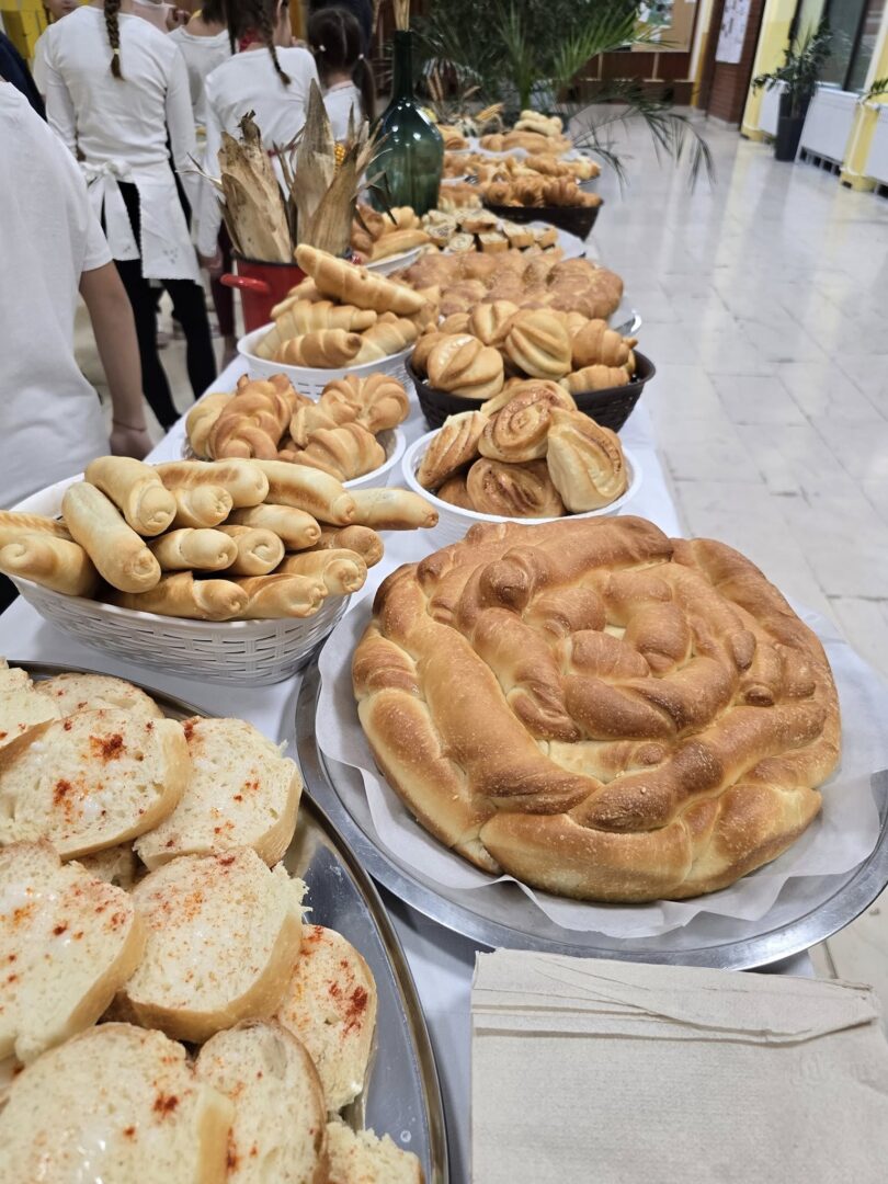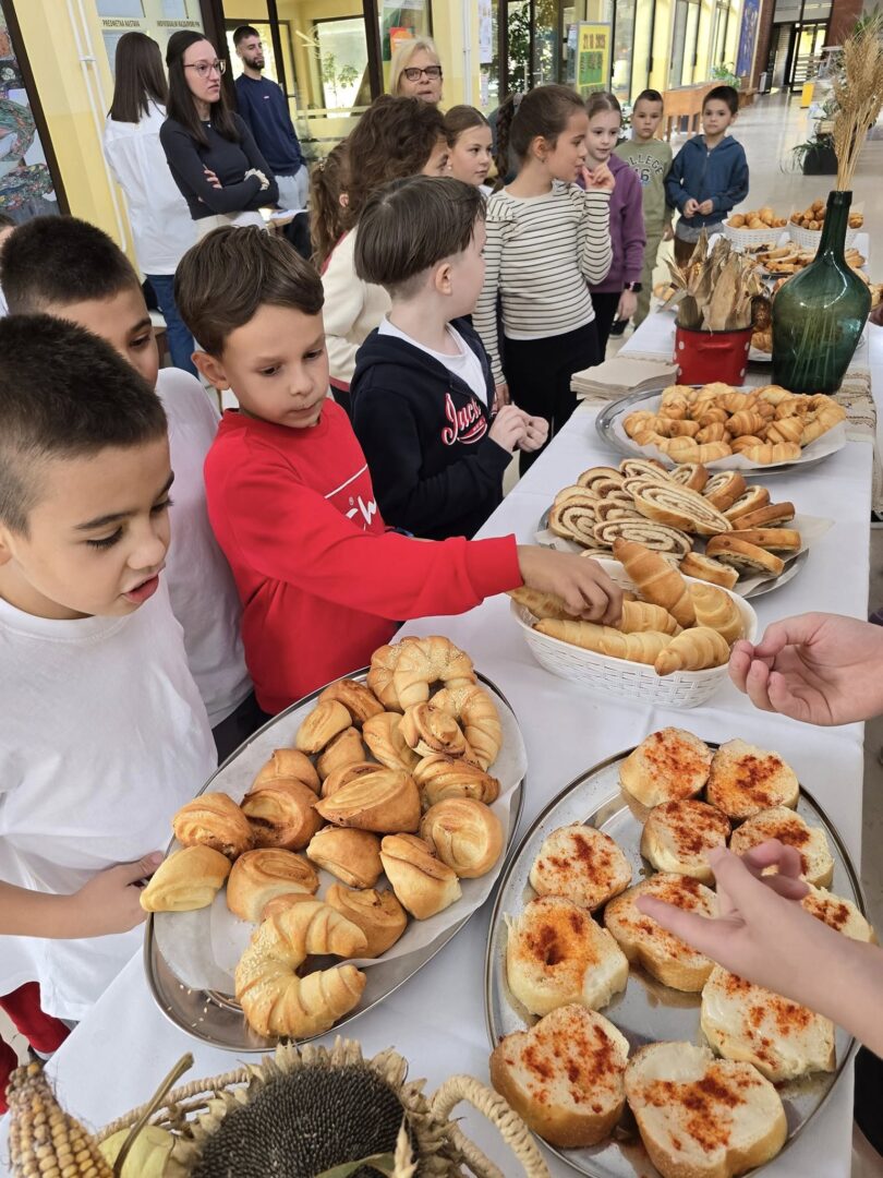 Nakon radijske emisije, učenici domaćini pozivali su svoje školske prijatelje na kušanje ukusnih pekarskih proizvoda koje su s puno pažnje pripremile naše kuharice. Školski je hol bio prigodno uređen — učiteljice su pripremile tematsku izložbu koja prikazuje dolazak težaka s njive, kola puna plodova i bogatstvo jeseni, dodatno naglašavajući ozračje zajedništva i zahvalnosti.