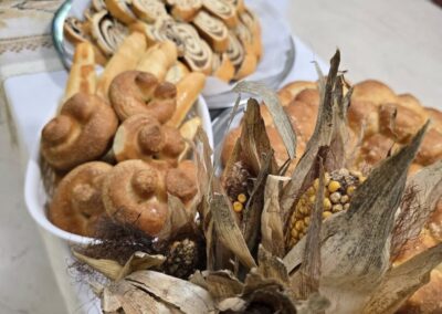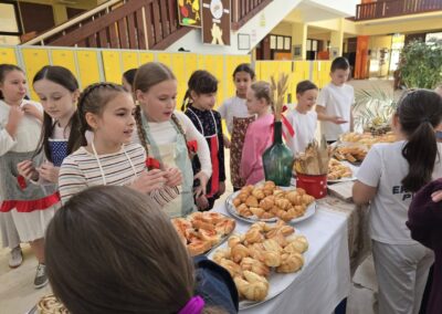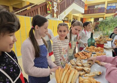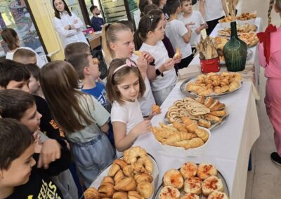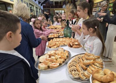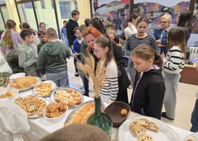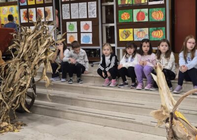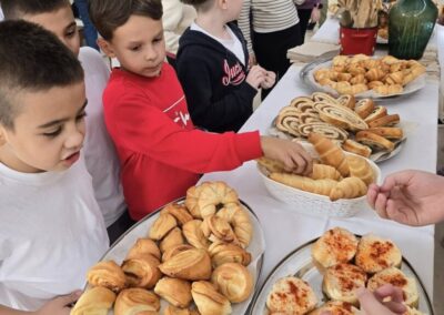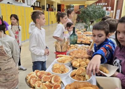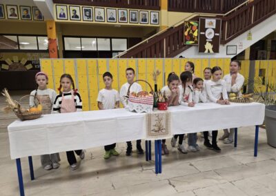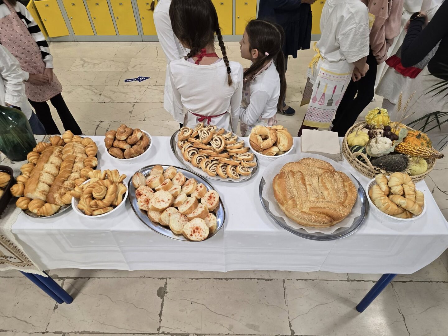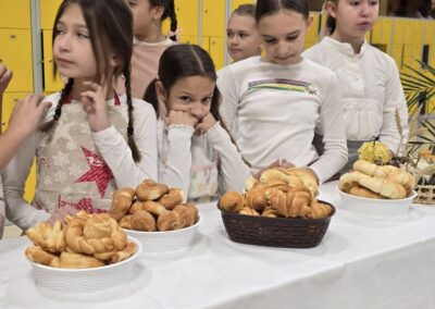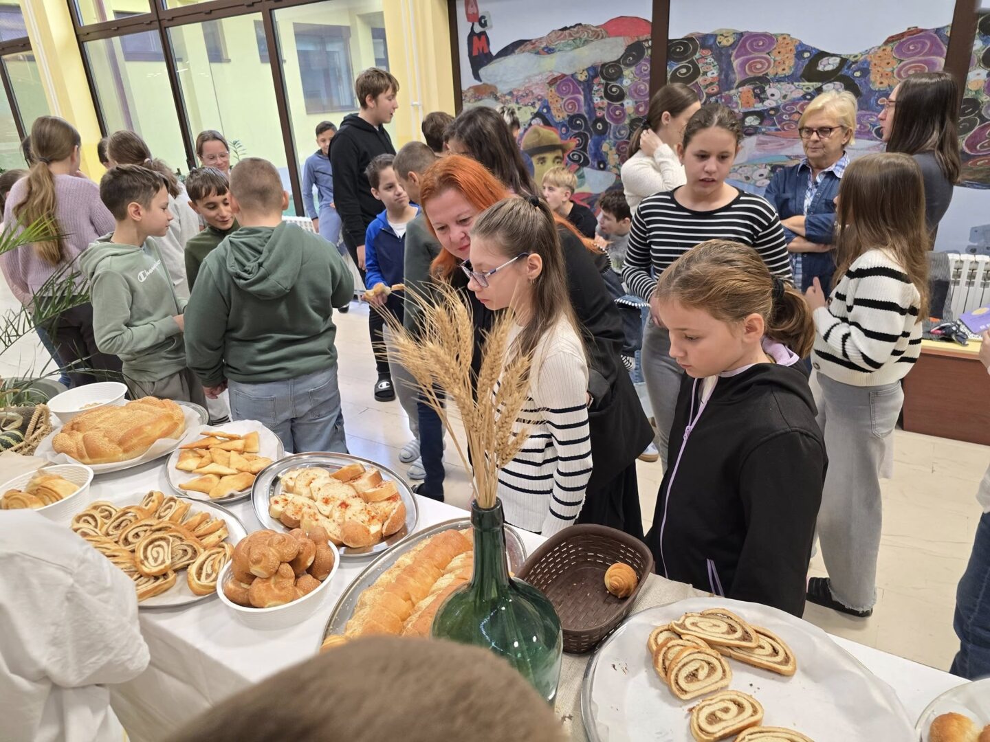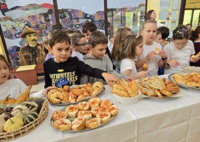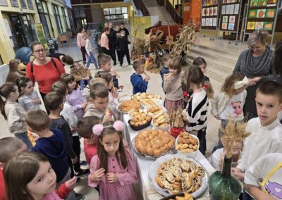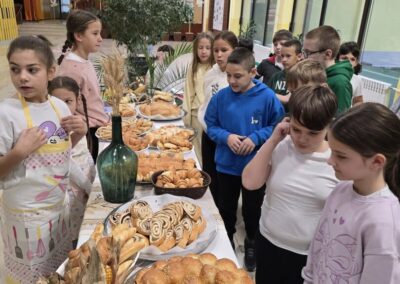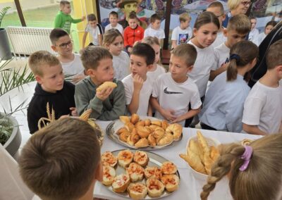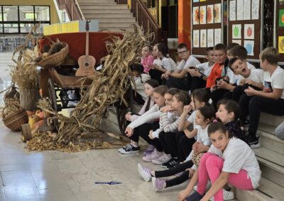 Nakon radijske emisije, učenici domaćini pozivali su svoje školske prijatelje na kušanje ukusnih pekarskih proizvoda koje su s puno pažnje pripremile naše kuharice. Školski je hol bio prigodno uređen — učiteljice su pripremile tematsku izložbu koja prikazuje dolazak težaka s njive, kola puna plodova i bogatstvo jeseni, dodatno naglašavajući ozračje zajedništva i zahvalnosti.
