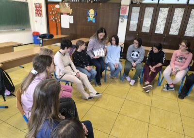 Učiteljica Martina pročitala im je slikovnicu “Magarac se osjeća poniženo”. Kao što i sam naslov govori, bavi se osjećajem poniženja kod djece. Poniženje je emocija koja se javlja kao reakcija na ponašanje druge osobe koja nam se namjerno ruga, vrijeđa nas, ismijava ili čini nešto drugo kako bi nas ponizila. Poniženje najčešće osjećamo kao kombinaciju emocija srama, ljutnje, ljubomore i straha, ali sve više istraživanja potvrđuje da ju osjetimo i kao bol u tijelu.